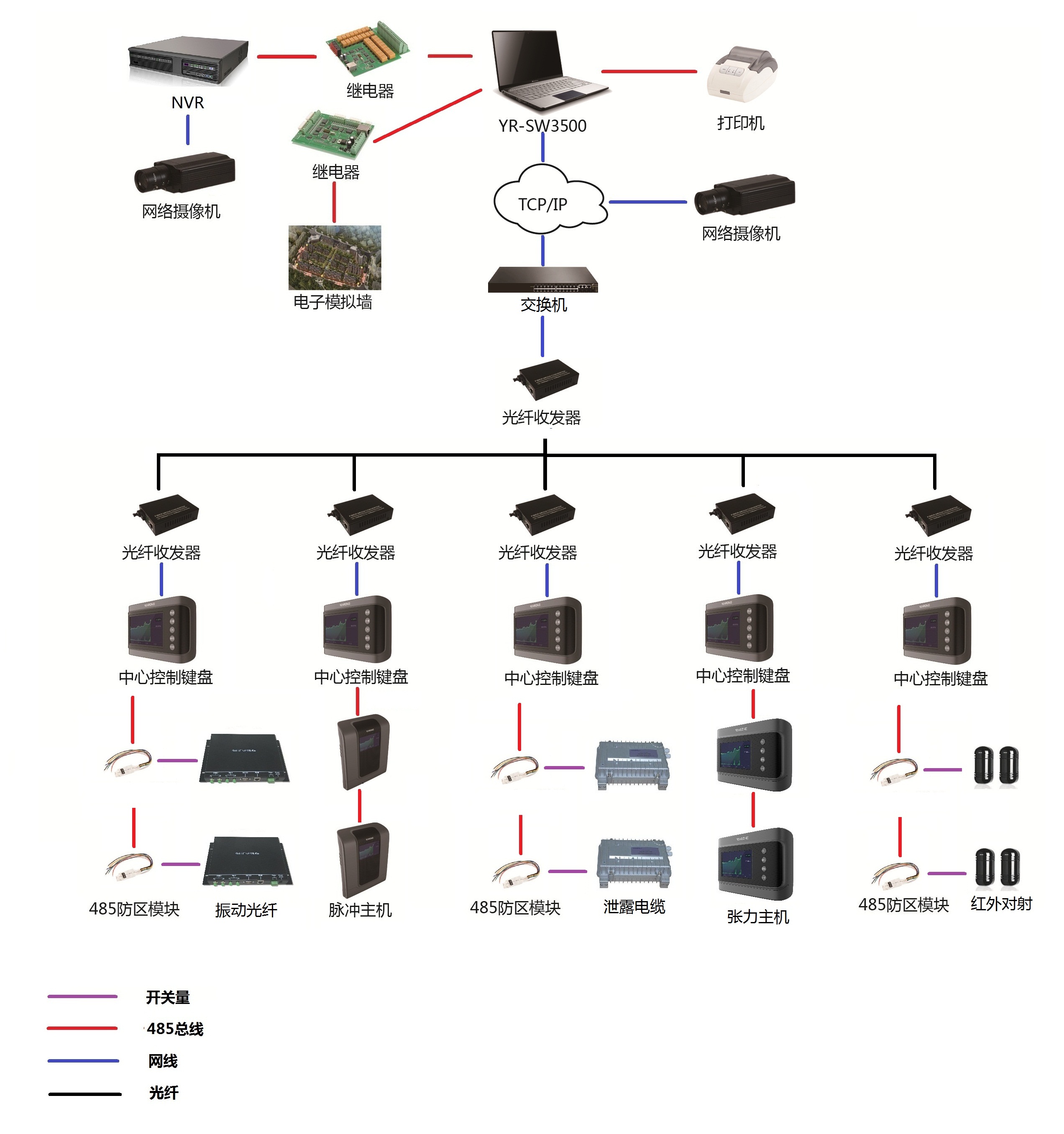 周界每0.6~1公里放置一臺(tái)中心控制鍵盤,這0.6~1公里區(qū)域內(nèi)的前端設(shè)備(脈沖圍欄主機(jī)/張力圍欄主機(jī)/泄露電纜主機(jī)/振動(dòng)光纖主機(jī)),通過RS485總線的方式接入到中心控制鍵盤,中心控制鍵盤通過光纖收發(fā)器接入交換機(jī),并使用網(wǎng)絡(luò)單機(jī)控制軟件SW3500進(jìn)行集中管理。