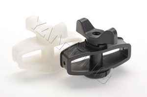 聚乙烯復(fù)合材料、耐腐蝕、強度高,用于收緊合金線的作用。中間收緊器是一直掛在前端圍欄上的,安裝合金絲時,把合金絲從中間緊線器側(cè)面的圓孔穿入,再對準(zhǔn)并穿過其中間的中縫,最后通過另一側(cè)面的圓孔穿出。